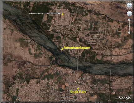 A place to clean body and clothes at the Cauvery River. In the background the outline of Rock Fort is more or less visible.